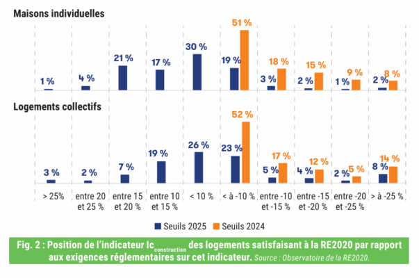 Dans les maisons individuelles, seules 27 % respectent les seuils de 2025, 8 % les seuils de 2028 et 3 % ceux de 2031.