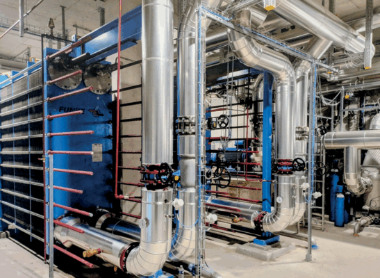 La chaleur géothermique est distribuée par un réseau de canalisations isolées qui alimente des sous-stations d’échange thermique au pied de chaque immeuble. Ces équipements remplacent les chaudières à gaz ou fioul collectives : la chaleur de l’eau du réseau est transmise au circuit interne des bâtiments pour le chauffage et la four-niture d’eau chaude sanitaire.
