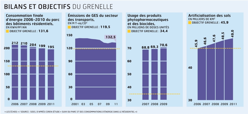 Si l’énergie dépensée dans le chauffage a baissé ses dernières années – moins 8% entre 2007 et 2010 – nous sommes loin des réductions prévues pour 2020. De plus, l’utilisation de ressources renouvelables progresse trop lentement. À dix points des objectifs du Grenelle (20%), nous sommes aujourd’hui à 13% du « bouquet énergétique ».