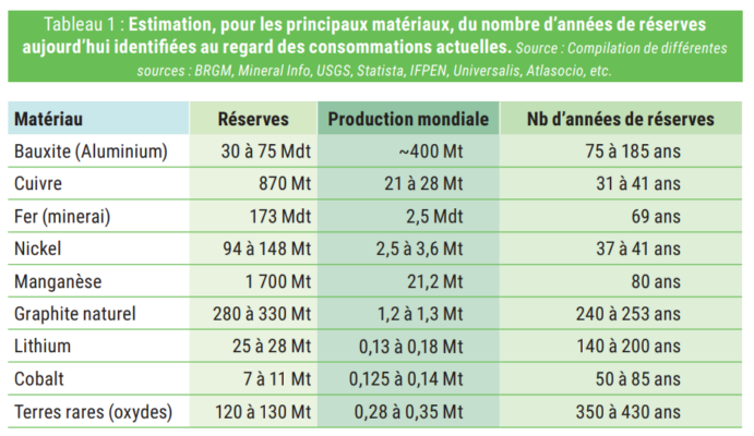 Le tableau ci-dessous récapitule les chiffres que l’on peut trouver dans la littérature relatifs aux réserves et la production annuelle des matériaux clés.
