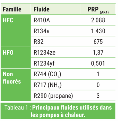 Les fluides utilisés aujourd’hui peuvent être de type HFC (hydrofluorocarbones), HFO (hydrofluoroléfines), hydrocarbures ou mélanges. Leur PRP, ou potentiel de réchauffement planétaire, varie dans de larges proportions (tableau 1).