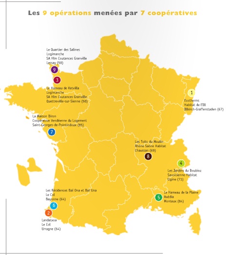 Initié depuis 2008, « 100 maisons durables et solidaires » est un projet de la Fédération Nationale des sociétés coopératives d´HLM pour respecter rapidement les normes des réglementations thermiques, 2012 et 2020. Dans un but d’innovation et de développement des bonnes pratiques, des maisons ont été ainsi construites (pour la location mais également en accession à la propriété) en respectant les contraintes d’un cahier des charges prévoyant le développement des savoir-faire locaux en matière de basse consommation. Réparties sur l’ensemble du territoire, neuf opérations ont été menées en 2010 .