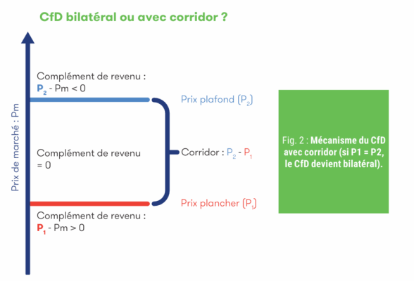 Suite à un accord intervenu à Bruxelles en octobre 2023, deux mécanismes ont ainsi été définis : d’une part les CfDs (Contracts for Différences) qui prévoient un prix plancher et un prix plafond pour le prix de gros (figure 2), d’autre part les PPA (Power Purchase Agreements), contrats de moyen et long terme signés de gré à gré entre les producteurs et les fournisseurs ou les gros consommateurs d’électricité. Dans un CfD, l’État prélève la rente lorsque le prix de gros dépasse le prix plafond et subventionne le producteur lorsque le prix de gros est inférieur au prix plancher. Cette rente peut ensuite être redistribuée au consommateur final pour lui permettre de faire face à la hausse des prix de gros. Le PPA est un contrat de gré à gré, signé hors marché, sur lequel l’État n’a pas son mot à dire, sauf s’il estime que ce contrat comporte des clauses léonines. Ces mécanismes seront applicables au nucléaire comme aux renouvelables.