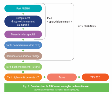 Le TRV est calculé par empilement des divers coûts de la filière électrique (figure 3). L’ARENH (tarif d’accès régulé à l’énergie nucléaire historique) en est l’une des composantes essentielles. Ce mécanisme permet, depuis mi-2011, aux concurrents d’EDF d’acheter chaque année et jusqu’en 2025, à un prix très avantageux (42 €/MWh), un volume de 100 TWh d’électricité d’origine nucléaire. L’objectif était au départ de permettre à de nouveaux fournisseurs de proposer des offres à des prix proches de ceux d’EDF en bénéficiant, eux aussi, du nucléaire historique. C’est le principe de contestabilité, cher aux défenseurs de la concurrence.