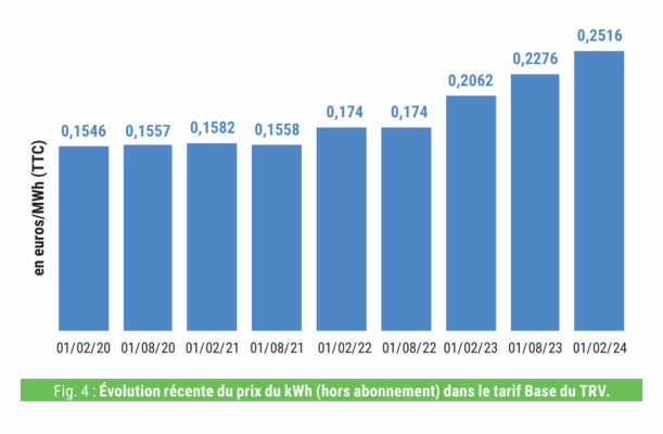 La Commission de régulation de l’énergie (CRE) a la charge de proposer chaque année le niveau du TRV. Mais en 2022 et 2023, l’État a mis en place un bouclier tarifaire et a plafonné fortement l’augmentation du TRV (figure 3).