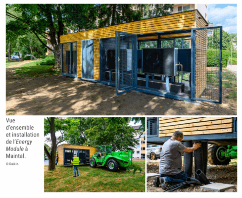 Un module prémonté en usine, rappelant la forme d’un conteneur, intègre l’ensemble des éléments nécessaires au chauffage et à la production d’eau chaude sanitaire de tous les logements d’un immeuble (pompe à chaleur, réseaux hydrauliques, bouteille de découplage et accessoires de chaufferie).