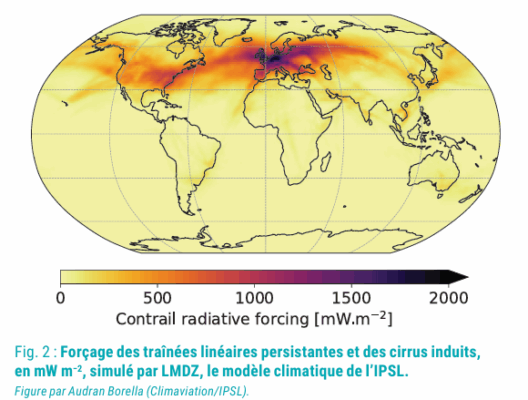 On nomme forçage radiatif la modification du bilan énergétique de la Terre exercée par une perturbation donnée, comparée à une situation préindustrielle de référence. Le changement climatique en cours se produit en réponse à de multiples forçages. Un forçage radiatif positif conduit à un réchauffement et un forçage radiatif négatif conduit à un refroidissement. La figure 2 montre la distribution du forçage radiatif des cirrus induits simulée par le modèle climatique de l’IPSL. Les forçages sont forts sur l’Amérique du Nord et l’Europe, où le trafic aérien est élevé, et l’Atlantique Nord, où les altitudes de vol sont élevées et la haute atmosphère est humide. Les forçages sont faibles sur la Chine et l’Inde, où l’air est plus sec et les altitudes de vol plus basses.
