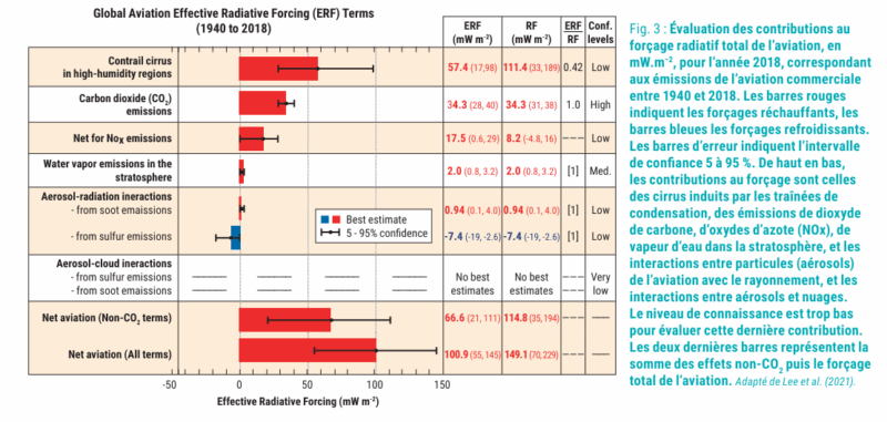 L’évaluation du forçage radiatif total de l’aviation la plus récente a porté sur l’année 2018 et a considéré les émissions de l’aviation sur la période allant du début de l’aviation commerciale, en 1940, à 2018. Les résultats sont présentés sur la figure 3. Le forçage des cirrus induits est positif, donc réchauffant. Selon cette évaluation, il est estimé à 57 mW.m−2, soit plus de la moitié du forçage total de l’aviation de 101 mW.m−2. Les émissions de dioxyde de car-bone de l’aviation ne seraient qu’en deuxième position, à 34 mW.m−2. Cependant, les incertitudes des effets non-CO2 sont très importantes. Les cirrus induits pourraient ainsi représenter trois fois le forçage du CO2 ou n’en représenter que la moitié. La contribution de l’un des effets non-CO2, celle des interactions entre particules émises par les moteurs et les nuages naturels, est si incertaine qu’elle n’a pas pu être évaluée.