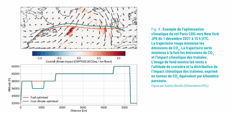 La figure 4 illustre une optimisation climatique de la trajectoire d’un vol. La trajectoire qui minimise le temps de vol en recherchant des vents favorables a un coût climatique CO2 et non-CO2 très important, de 514 tonnes de CO2 équivalent, car elle traverse deux régions où les traînées et leurs cirrus induits sont très réchauffants. Éviter ces régions par une combinaison de reroutages verticaux et horizontaux réduit le coût climatique de ce vol à 224 tonnes de CO2 équivalent, au prix d’une augmentation de consommation de carburant de 1 %. Il y a bien sûr de nombreuses sources d’incertitudes dans ce calcul, provenant notamment des modèles de calcul de l’impact climatique des traînées et des prévisions météorologiques. Mais une analyse des risques permettrait de maîtriser son action et les gains et pertes potentiels.